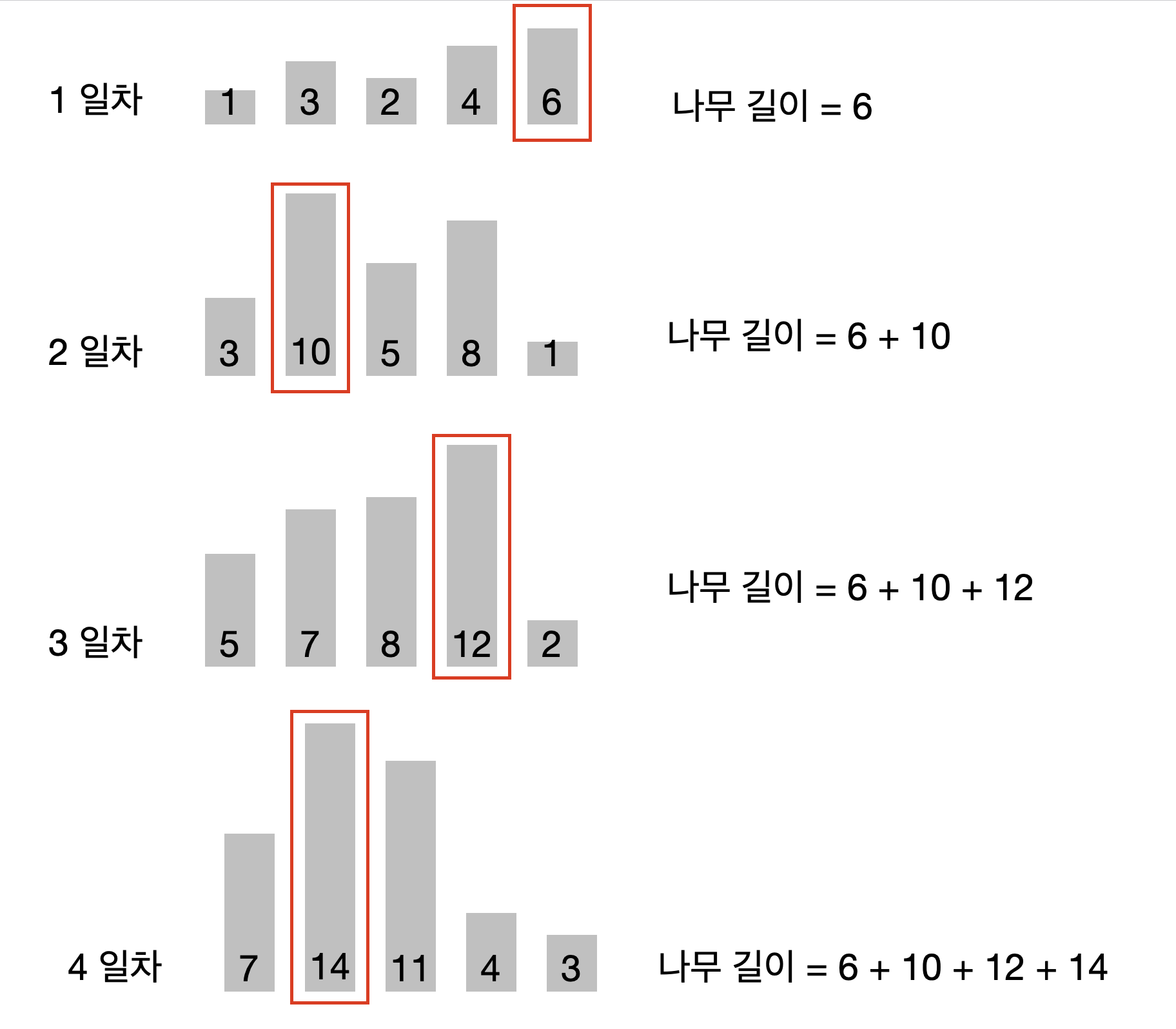 n개의 나무가 있는데, 하루에 한 나무씩 n일 산에 오르며 나무를 잘라갈 것이다. 나무들 자라는 길이는 나무마다 다르다.