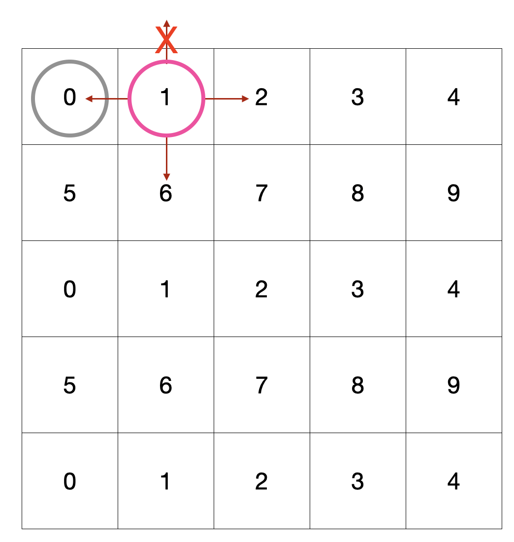 다음 움직임으로는 상, 하, 좌, 우로 움직여 다음 숫자를 선택하고, depth 를 하나 더 증가시킬 것이다.
